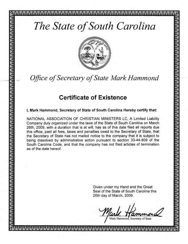 On March 26th, 2009, it was formally acknowledged as a legal entity in the State of South Carolina by Secretary of State Mark Hammond. The NACM continues this status.